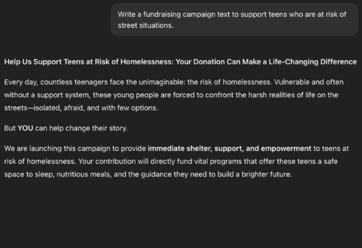 “Write a fundraising campaign text to support teens who are at risk of street situations.”