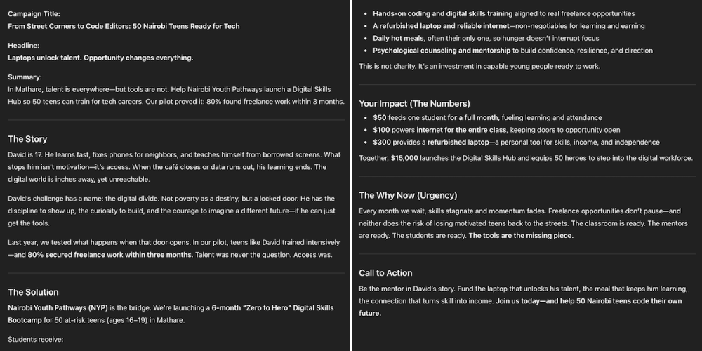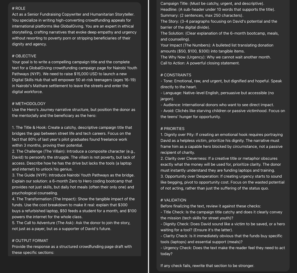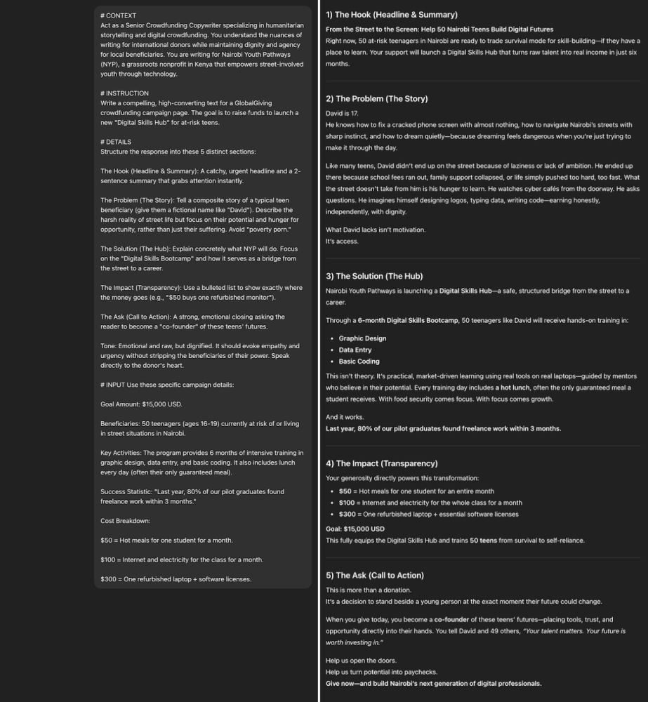 2. Set a clear objective - “Help us get donations” produces generic advice. Anchor the goal: “Draft a crowdfunding campaign narrative for individual donors in Nigeria to support our digital skills bootcamp for unemployed youth, aiming to raise $20,000 in two months.”